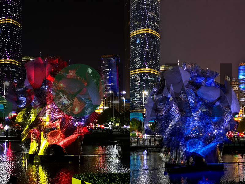 2019年11月18日,廣州國際燈光節(jié)正式亮燈。今年的燈光節(jié)在立意上充分詮釋了“國潮正當(dāng)紅”。海心沙會(huì)場的主題為“國潮”,作品《五音之空》正取材于中國傳統(tǒng)五音——“宮商角徵羽”。“羽”采用兩組燈光作品《云間玲瓏,海心之珠》、《木棉花開,英雄之城》,分別從“水”鬼斧神工般的雕琢出海心之珠,到“水”潤物無聲的滋養(yǎng)出花城花開,展示羽音的豐富內(nèi)韻。。
