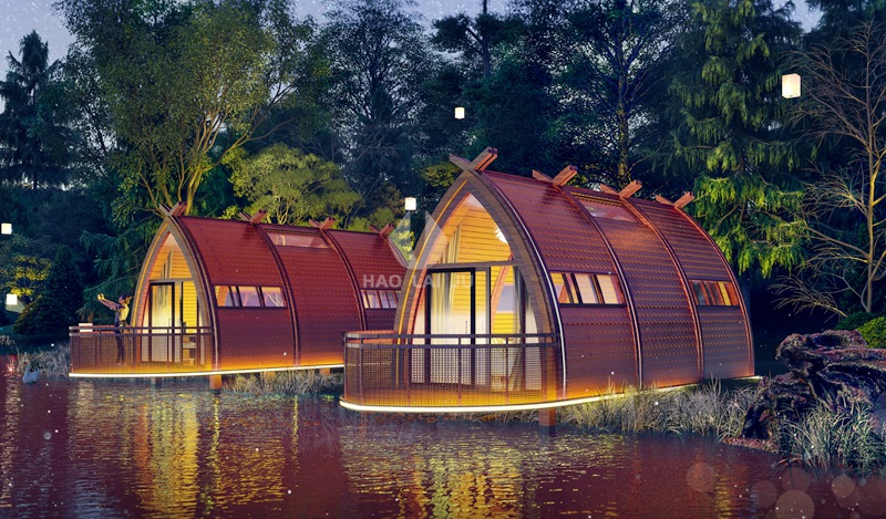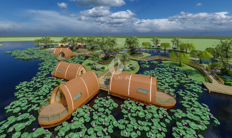 施工的過程也是最大限度的減少對環(huán)境的破壞,結構構件由工廠預制后再現(xiàn)場組裝,船屋主體由插入地下中的金屬管樁提供支撐。施工現(xiàn)場無濕作業(yè)無揚塵,清潔簡單高效,是保護生態(tài)環(huán)境的最佳建造方式。