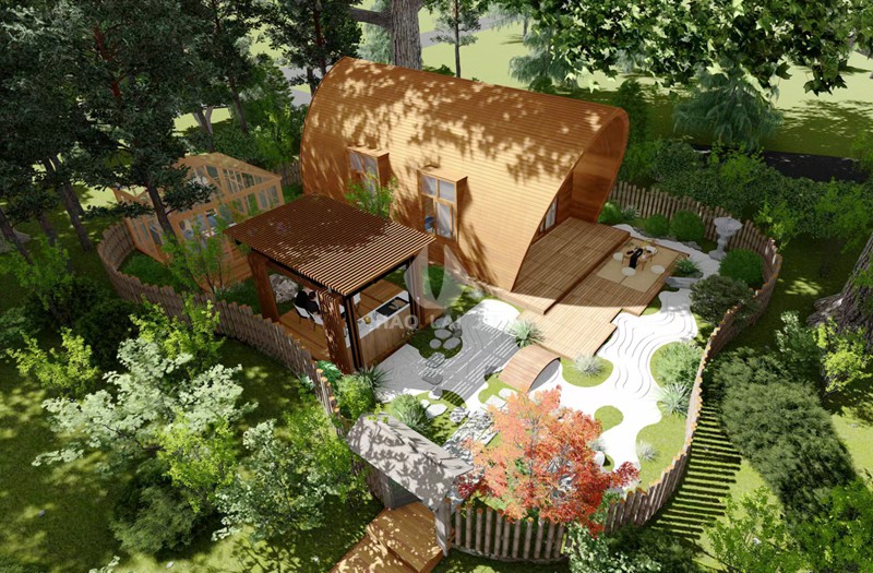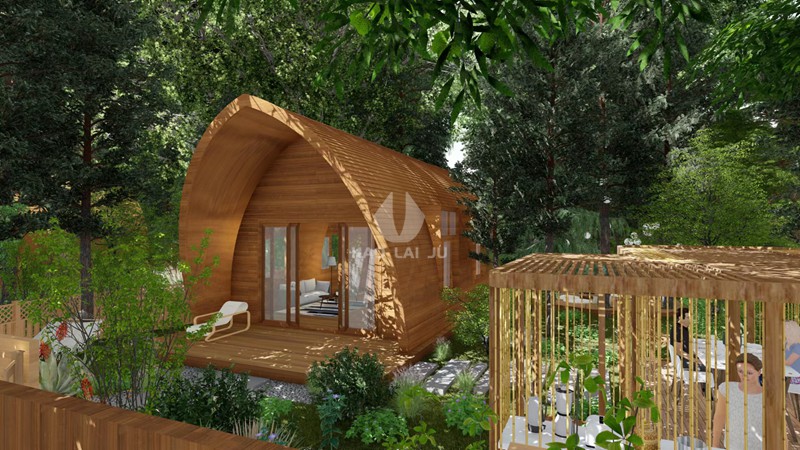 船屋設計最大的特點是外觀融于自然,內(nèi)部簡單樸素,遵循有所為,有所不為原則,保證景觀的合理性、舒適性,結合周邊環(huán)境,以船屋的形式還原村野生活。