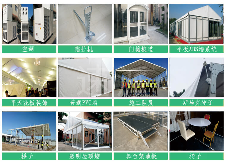 我司嚴格執(zhí)行ISO9001的質量管理體系,確保不良產品的最小化及客戶滿意度的最大化。我們的的主要產品包括可移動的模塊化鋁合金支架篷房,有不同風格的篷房及裝飾可供選擇,篷房跨度從3米到60米。此外,還包括錐頂篷房和吊頂篷房,以及篷房配件,如照明燈具、地板、空調、桌椅及其它用于篷房內部的家具。篷房可廣泛應用于大小型活動、婚慶、展會、體育、酒店、航空和工業(yè)等其它領域。篷房框架結構為高強度鋁合金6061/T6型材,篷布為防水、阻燃的雙面PVC涂層聚酯纖維布,主體結構風載荷不少于100Km/h。